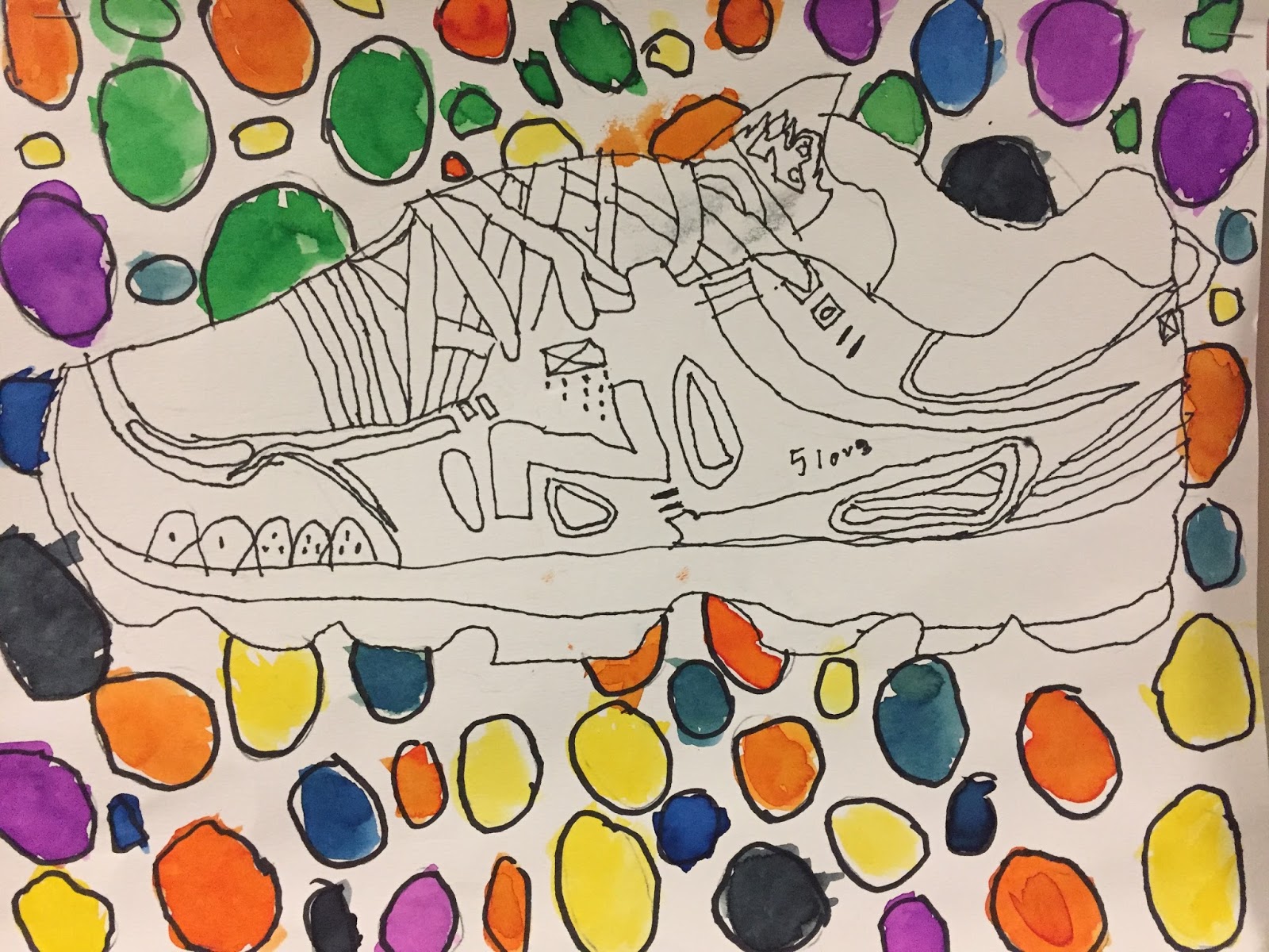 We started with contour and blind contour drawing, and learned about adding expressive lines. Super vibrant liquid watercolor was added to the backgrounds and some students experimented with adding salt and rubbing alcohol to the paint.